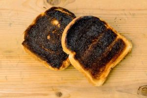 toast was burnt during toasting. burnt toast at breakfast.